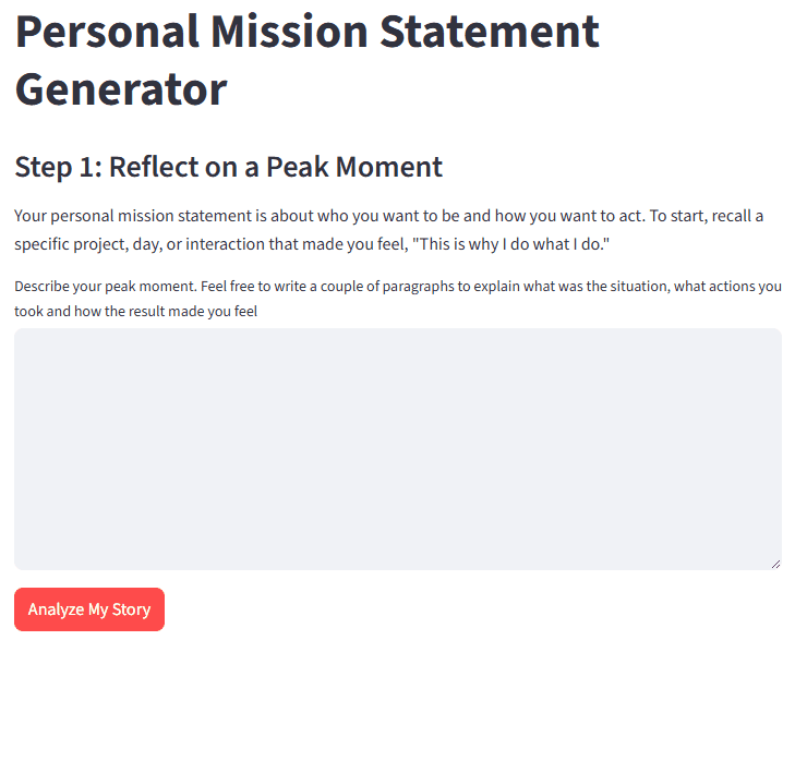 I wanted to fix this, so I built a simple AI-powered tool that grounds a mission statement in a user's actual experiences. This post is a look under the hood at the product-driven decisions, rapid prototyping, and technical problem-solving required to turn that insight into a working demo.