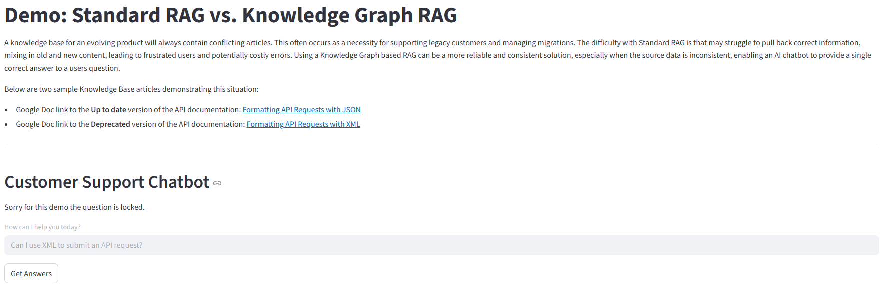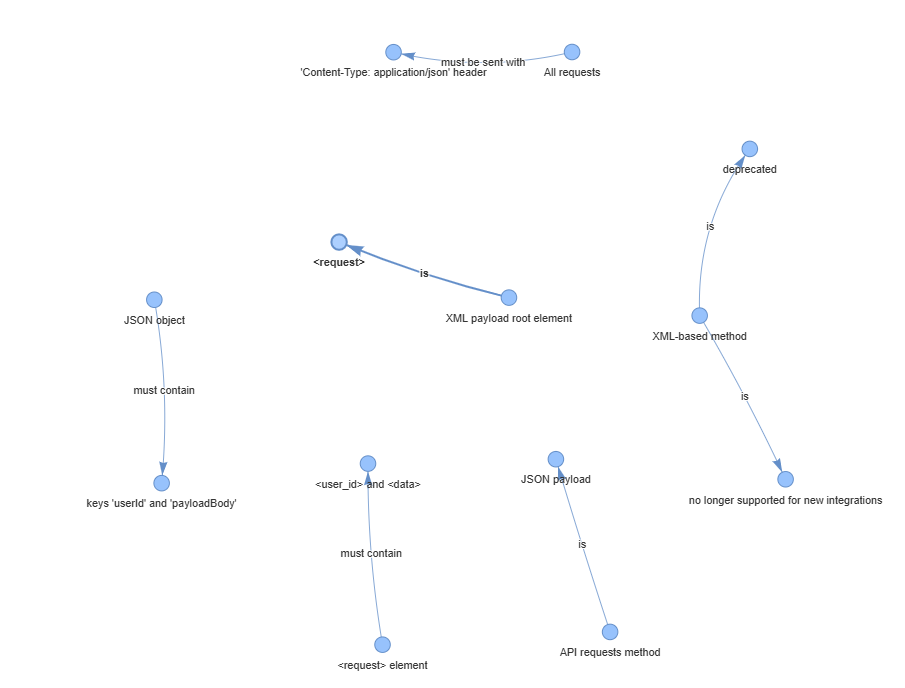 Back to our example, I used the same LLM (Gemini 2.0 Flash) to process the context provided by the two different search functions. The difference is in the context that is provided by the search function of the two different approaches. If we specifically ask the Standard RAG chatbot “Can I use XML to submit an API request?”, it will reply that this is possible, even though the method is deprecated. However, asking the GraphRAG chatbot the same question gets the clear response that XML is no longer supported and JSON is the correct payload for an API request.